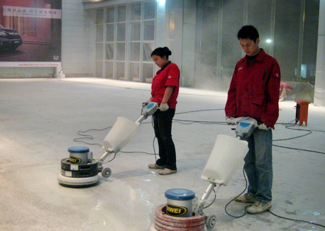 6、晶面處理:經過以上工藝之后,就可以進行晶面處理了,我們用的是格蘭高晶面加硬劑K2,加光劑K3按照其使用工藝說明,通過G681晶面翻新機加溫加壓低速打磨,使藥劑產生合成反應,使地面形成防滑的堅硬鏡面。